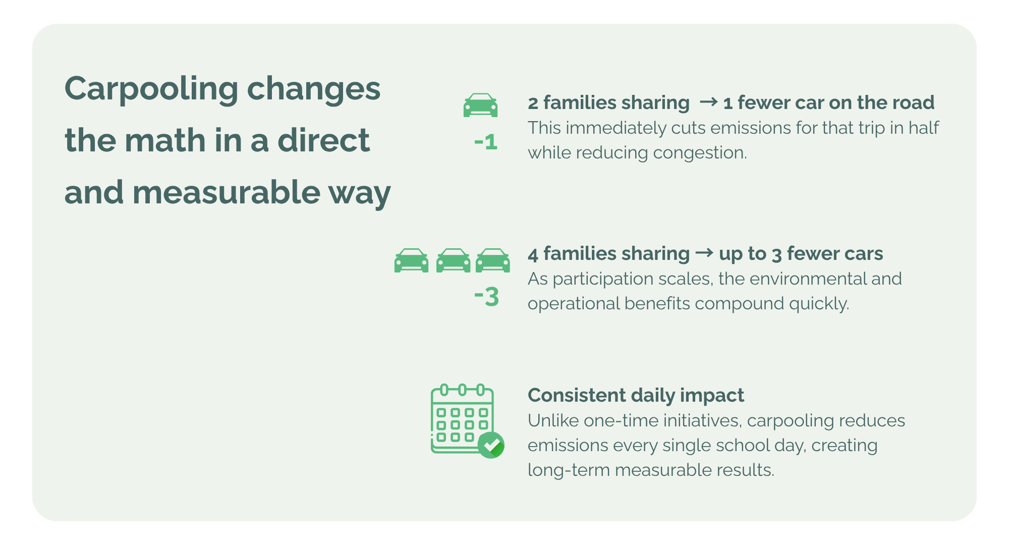 While individual car trips may seem small, the cumulative impact of daily school transportation across hundreds of families is significant. A typical passenger vehicle emits about 4.6 metric tons of CO₂ per year (U.S. EPA), and school commutes represent a consistent portion of that usage. For a school with 400 families making daily drop-offs and pickups, the cumulative emissions add up quickly, especially when most trips involve single-occupancy vehicles.Carpooling changes the math in a direct and measurable way: