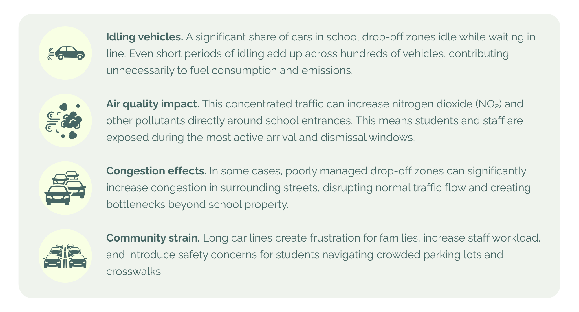 The daily school commute creates a concentrated surge of traffic that has outsized environmental and operational impacts compared to typical neighborhood patterns. School drop-off traffic is one of the most concentrated sources of vehicle emissions in any neighborhood. Key challenges include: