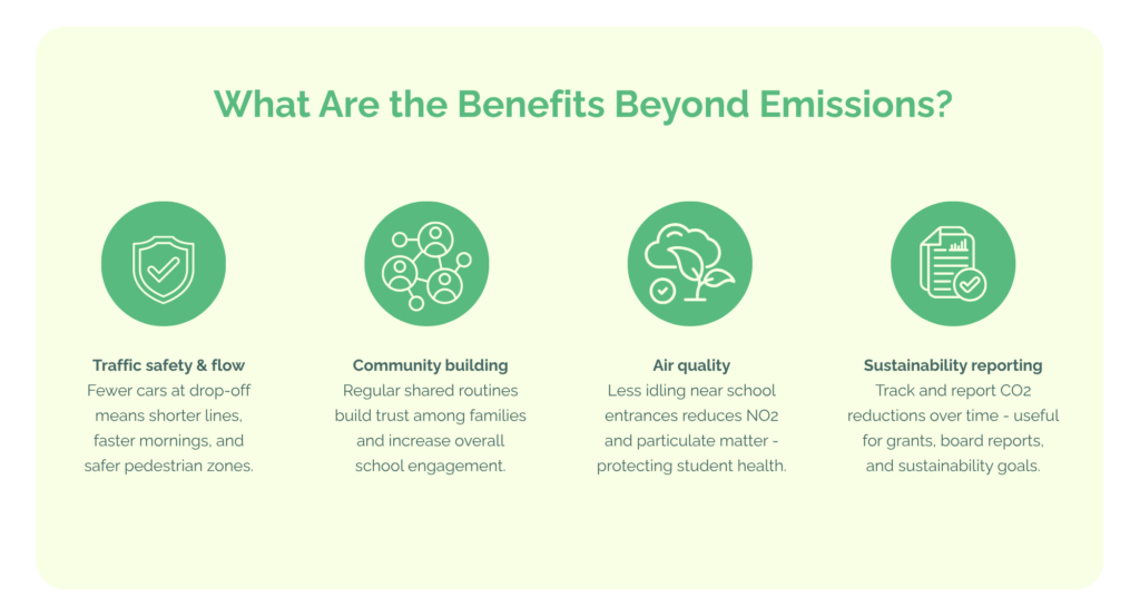 While emissions reduction is a primary goal, schools that implement carpooling programs often see broader operational and community benefits.