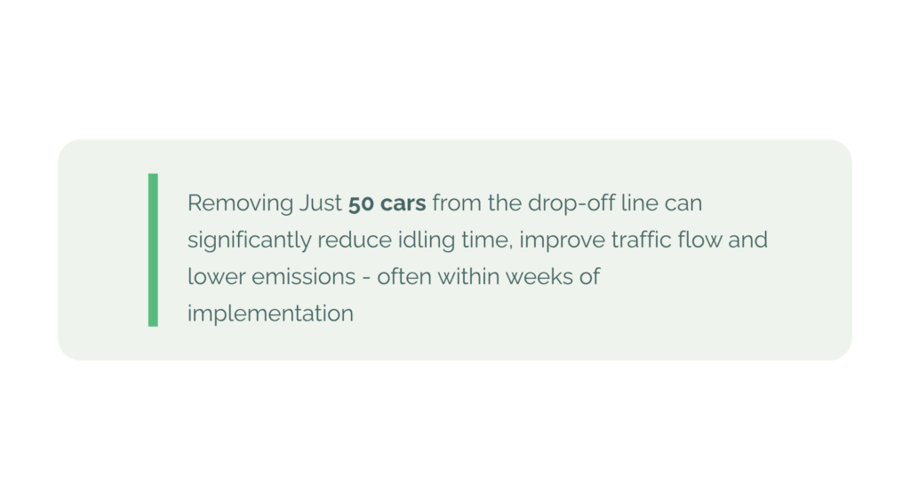 At a mid-sized school, removing just 50 cars from the drop-off line can significantly reduce idling time, improve traffic flow, and lower emissions — often within weeks of implementation.