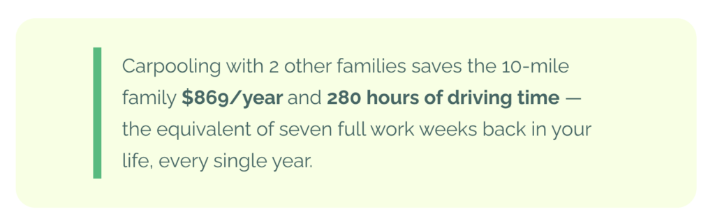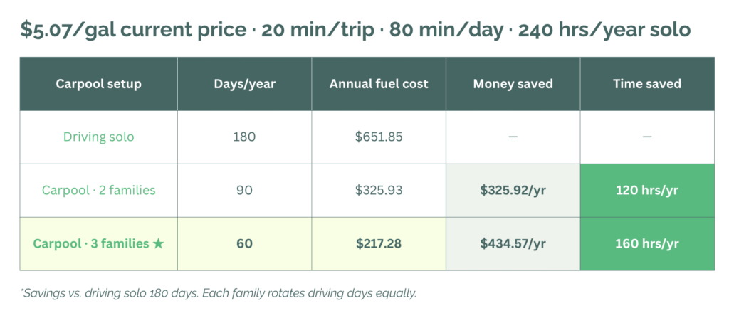 No new car. No EV. No lifestyle change. Just sharing a trip that’s already happening with a neighbor heading to the same school. When families rotate driving days, costs drop proportionally — and the time savings are even more striking than the money savings.