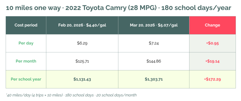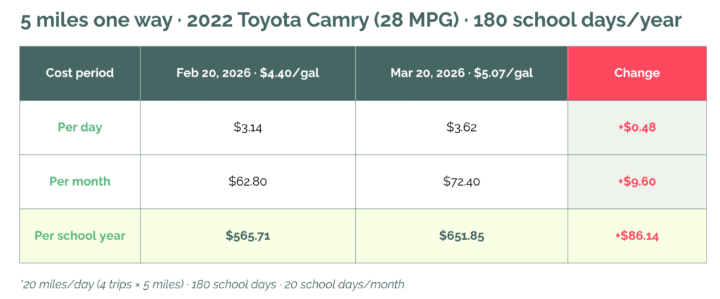 These numbers are Hawaii-specific, but the logic applies everywhere. At the current national average of $3.72/gallon, a mainland family driving 10 miles one-way is still spending well over $960/year just on the school run.